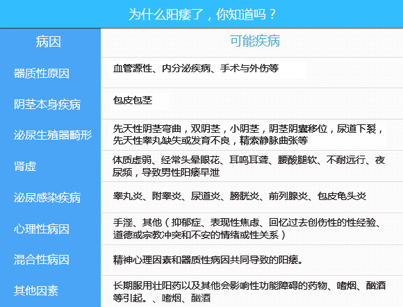 上海九龙医院韩用涛主任指出:勃起功能障碍成为现在性功能障碍中的常见疾病,80%都是由于心理性因素引起,而只有10-20%是由于器质性病因引起,只有及时到正规医院检查,了解清楚其诱因对症下药才可达到根本康复的目的。